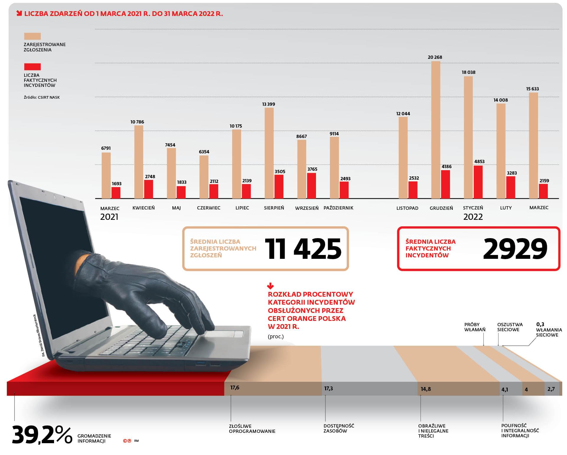 Kilka dni temu został opublikowany raport CERT Orange Polska (Computer Emergency Response Team) za rok 2021. Jak zapewniają jego twórcy, setki milionów zablokowanych zdarzeń phishingowych w ciągu roku pokazują nie tylko rosnącą skalę zagrożeń, ale także to, że instytucji CERT Orange udaje się je coraz skuteczniej wykrywać. Pomagają w tym uczenie maszynowe i sztuczna inteligencja. Orange wskazuje m.in., że dzięki CyberTarczy, czyli specjalnym rozwiązaniom przeciwdziałającym atakom hakerskim, powstrzymał w swojej sieci ponad 335 milionów incydentów phishingowych powiązanych m.in. z wyłudzaniem danych logowania do kont bankowych lub profili społecznościowych. Incydenty bezpieczeństwa obsłużone przez CERT Orange Polska to m.in. „gromadzenie informacji”, czyli podejmowanie działań mających na celu uzyskanie informacji o systemie lub sieci bądź ich użytkownikach, zmierzających do nieautoryzowanego dostępu. Równie ważne są kwestie ataków poprzez złośliwe oprogramowanie czy blokowanie zasobów sieciowych. Zdaniem szefa CERT Orange Polska kolejne miliony incydentów nie hamują rozwoju cyfrowej transformacji, ale właśnie ją napędzają.