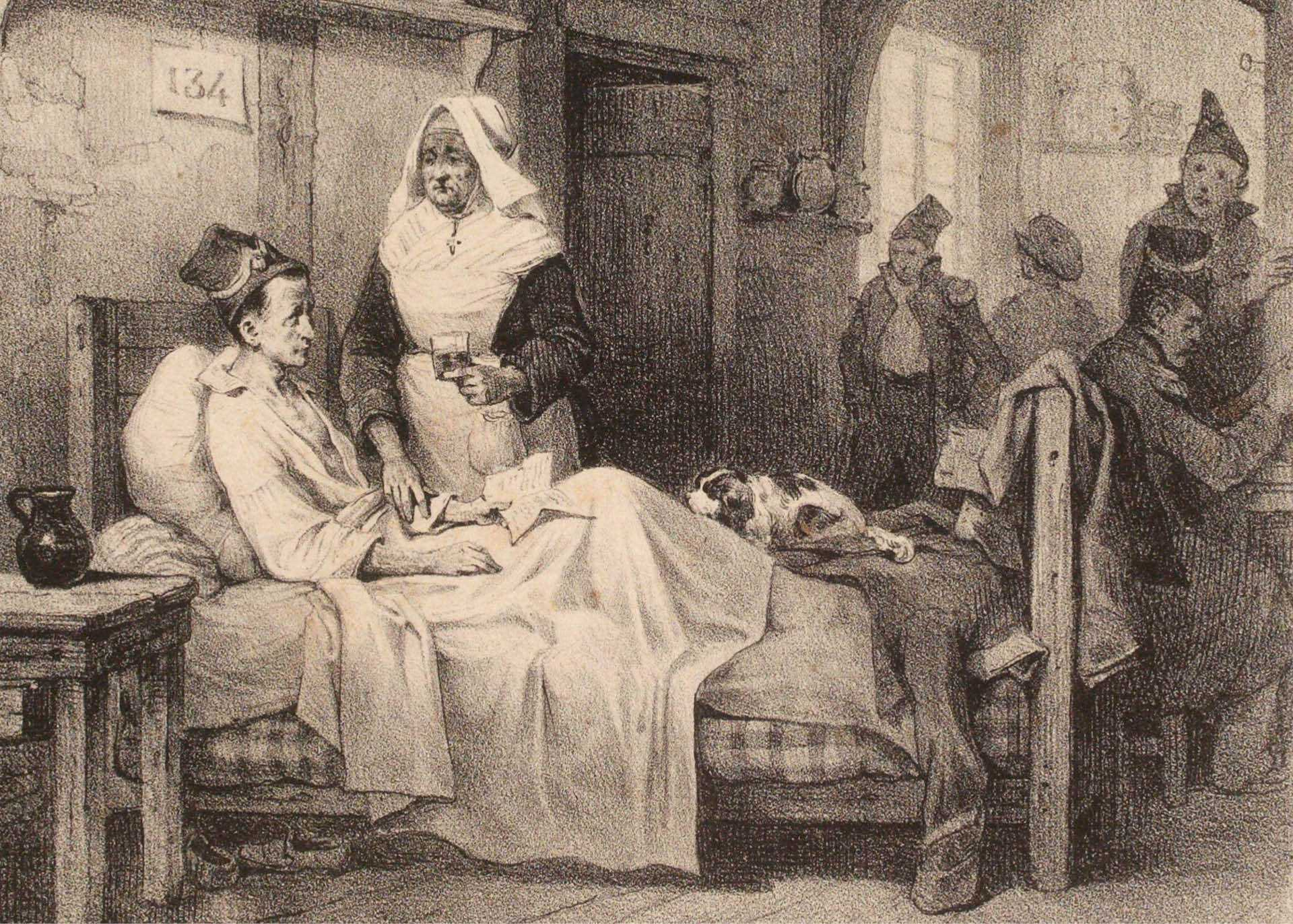 Pielęgniarka opiekuje się pacjentką chorującą na nostalgię, litografia z 1833 r. / Alamy Stock Photo/BE&W