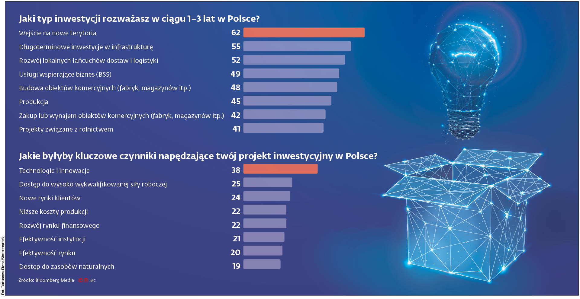 Inwestycji globalnych oraz lokowanych w Polsce dotyczyło badanie Bloomberg Media, którego wyniki mogli poznać uczestnicy bloku tematycznego DGP. Zostało ono przeprowadzone wśród inwestorów z całego świata zainteresowanych lokowaniem kapitału. Za najważniejsze szanse w skali globalnej, w ciągu najbliższych trzech lat, inwestorzy uznali przede wszystkim te, które wiążą się z cyfryzacją: przyspieszoną transformację cyfrową, gwałtowny wzrost e-commerce oraz umowy regulujące gospodarkę cyfrową. Pytano też o główne czynniki motywujące do inwestowania w poszczególnych krajach. W przypadku Polski okazały się nimi: możliwości, jakie stwarzają technologie i innowacje, dostęp do wykwalifikowanej siły roboczej i rynek nowych klientów. Wysoko plasowały się również wśród podawanych odpowiedzi: niższe koszty produkcji i rozwój rynku finansowego.