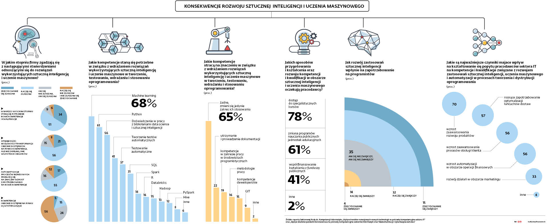 Wskazuje ono również na to, jakie nowe kompetencje i umiejętności staną się w związku z tym pożądane. Generalnie 85 proc. badanych uznało, że w związku z rozwojem sztucznej inteligencji i uczenia maszynowego w bardzo wysokim stopniu staną się potrzebne nowe kompetencje i kwalifikacje, a 72 proc. wskazało, że automatyzacja procesów biznesowych przełoży się na znaczny wzrost zapotrzebowania na nowe umiejętności.