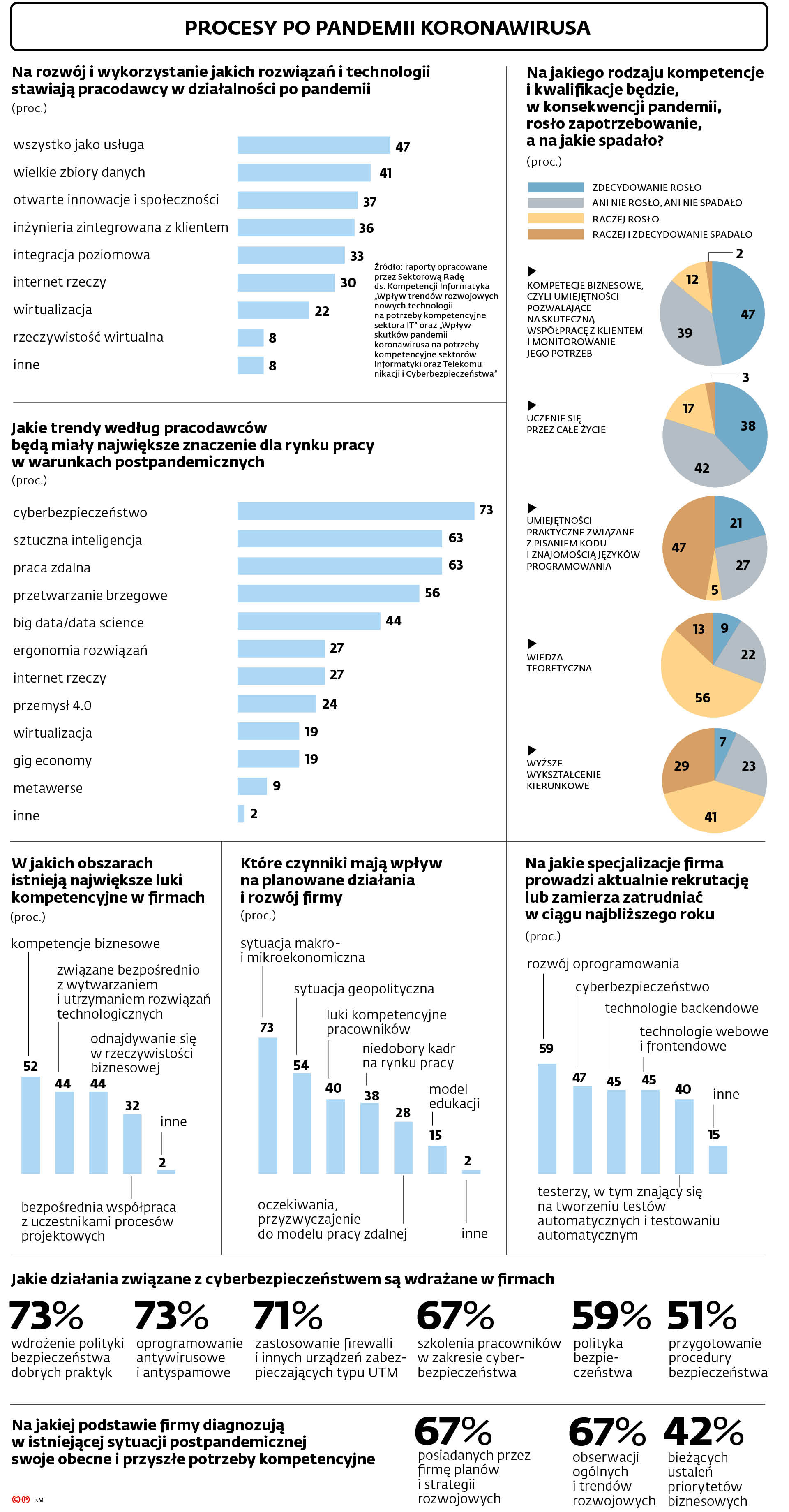 Mówiąc o trendach, które będą miały największe znaczenie dla rynku pracy w warunkach postpandemicznych, największy odsetek pracodawców wskazuje na cyberbezpieczeństwo, jako sektor, którego rola i znaczenie będzie rosło. Takiego zdania jest ponad 70 proc. badanych. Niewiele mniej, bo ponad 60 proc., wskazuje na sztuczną inteligencję i pracę zdalną. Kolejnymi trendami, które znacząco mają wpłynąć na rynek pracy są uczenie maszynowe, przetwarzanie brzegowe oraz big data/data science.