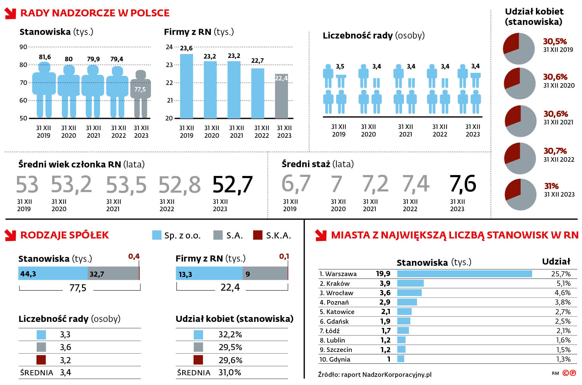Na koniec 2023 r. w Polsce we wszystkich radach nadzorczych w spółkach akcyjnych, z ograniczoną odpowiedzialnością i komandytowo-akcyjnych zasiadało ok. 62 tys. osób, które zajmowały ponad 78 tys. stanowisk. Nawiasem mówiąc, gdybyśmy dołożyli spółdzielnie, fundacje i stowarzyszenia, gdzie funkcjonują rady nadzorcze albo komisje rewizyjne, to można śmiało mówić o niemal 200 tys. stanowisk.