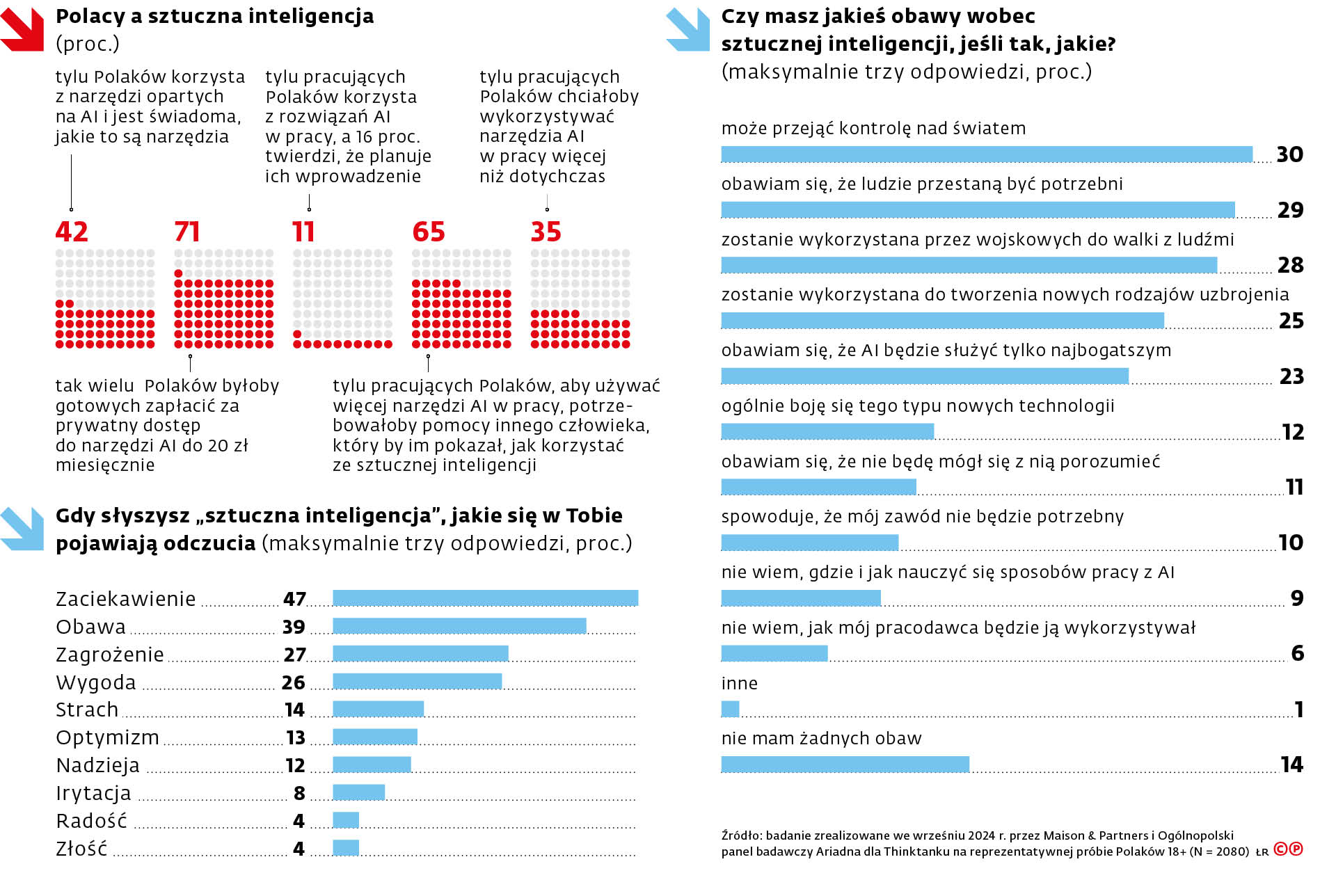 Z badaniem PIE koresponduje częściowo badanie zrealizowane we wrześniu 2024 r. przez ogólnopolski panel badawczy Ariadna, Maison & Partners oraz ośrodek THINKTANK. Zaledwie 9 proc. ankietowanych pracowników powiedziało, że w ich firmach wykorzystywane są rozwiązania AI. Poza tym aż jedna trzecia z nich nie potrafiła odpowiedzieć na pytanie, czy w ich przedsiębiorstwach już korzysta się ze sztucznej inteligencji. Mieli przy tym potężne obawy związane z nadejściem AI. Aż 65 proc. bardzo lub w umiarkowany sposób nie chce, by sztuczna inteligencja była szerzej wykorzystywana w ich firmach.